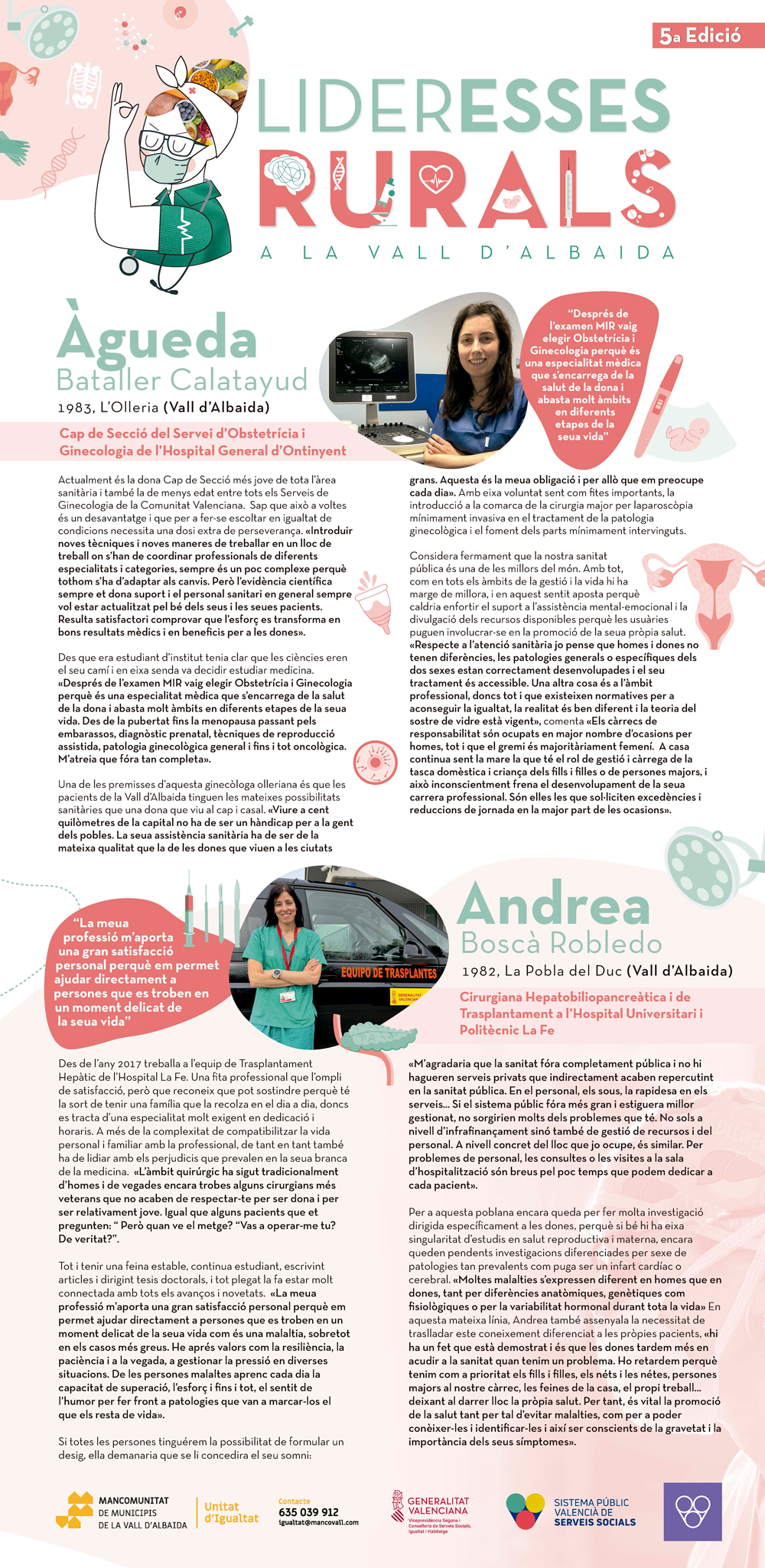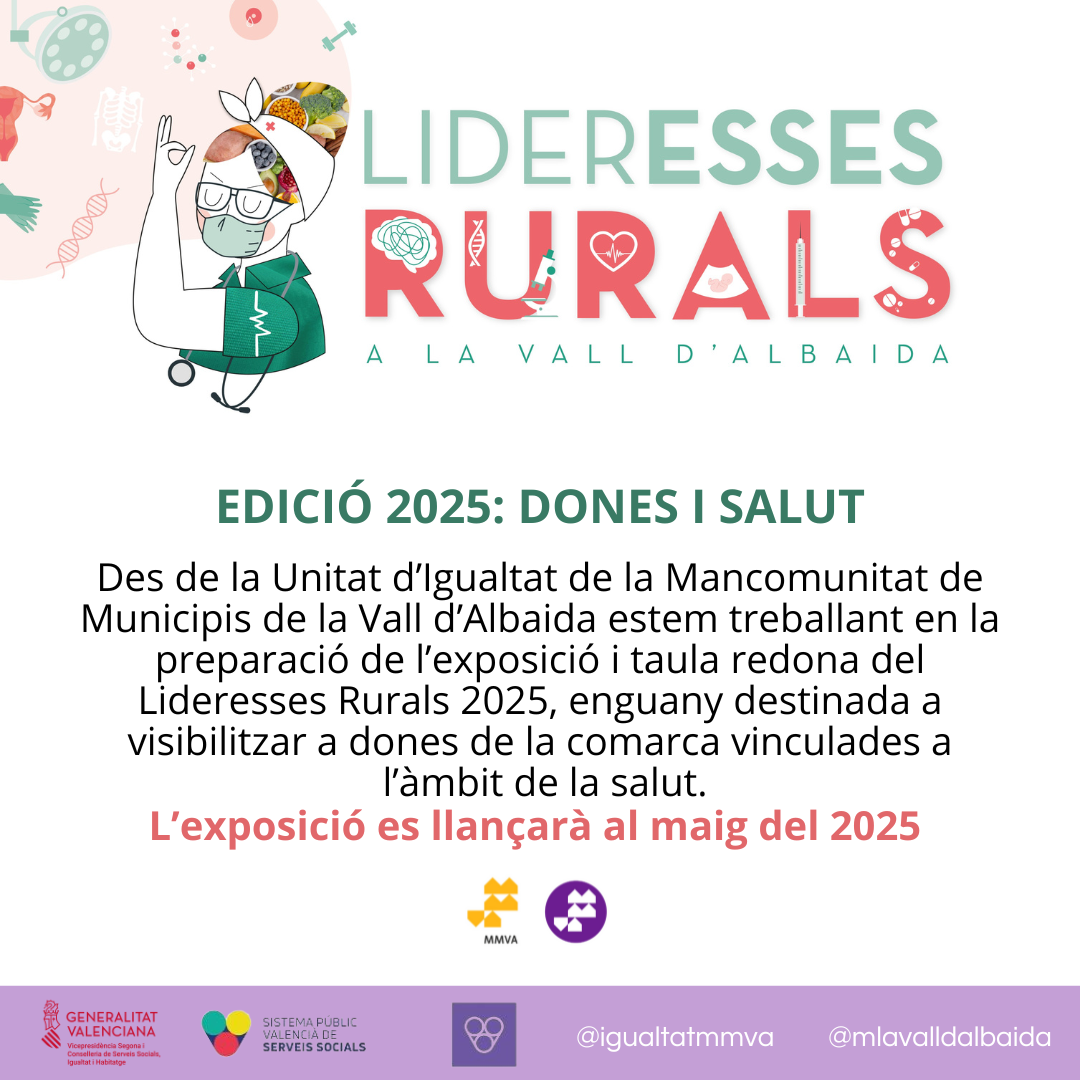 La cinquena edició del projecte «Lideresses Rurals» pretén posar de relleu les experiències de dones vinculades a la promoció de la salut des de diferents especialitats, àmbits i disciplines. Dones amb trajectòries que il·luminen i inspiren a d’altres dones, joves i xiquetes de la Vall d’Albaida. Dones amb experiències professionals o de vida que , potser sense ser conscients, promouen l’empoderament i la capacitat d’exigir la cura del propi cos, en els diferents estadis de la vida, tot incorporant la perspectiva de gènere.